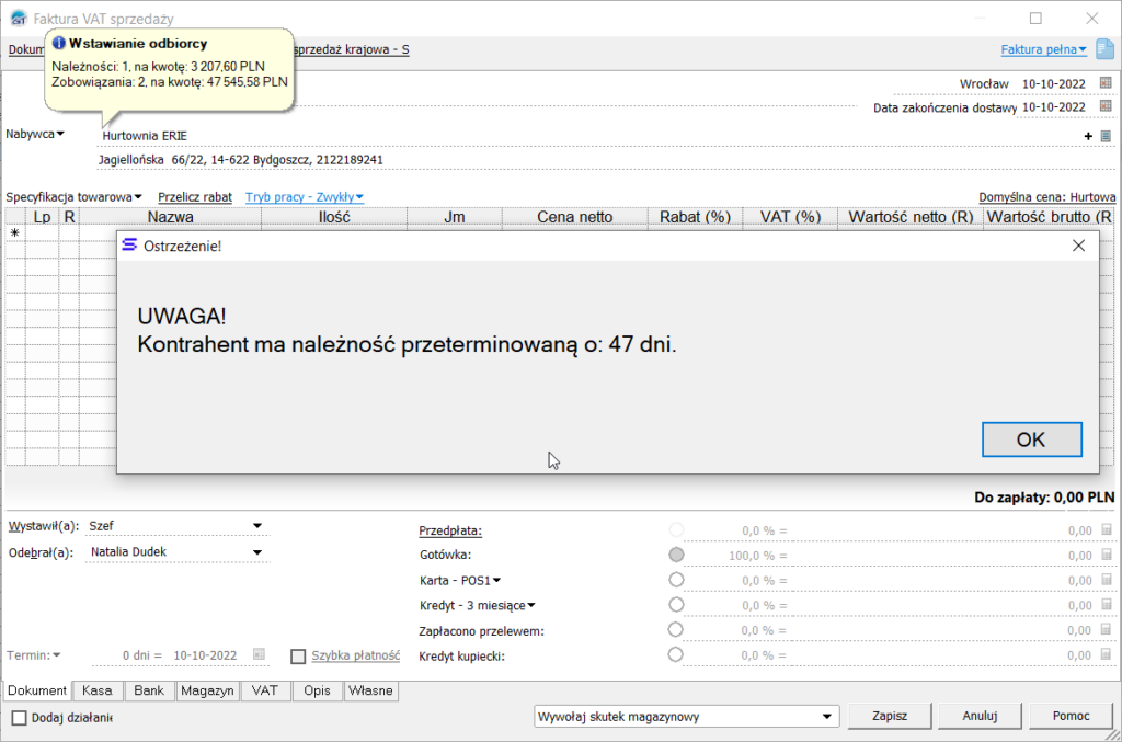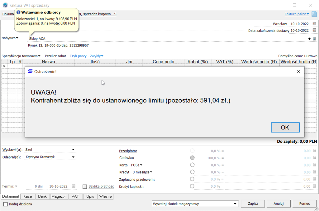 Program rezydentny (działający w tle), który ostrzega o wybraniu kontrahenta z przekroczonym limitem płatności, lub zbliżającego się do limitu. Działa bez Sfery.
