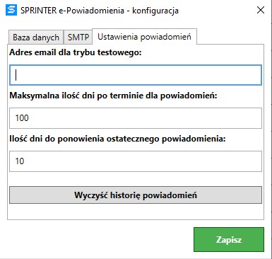 Dostępne są również ustawienia konfiguracyjne, takie jak parametry SMTP, liczba dni do przypomnienia oraz tryb testowy.