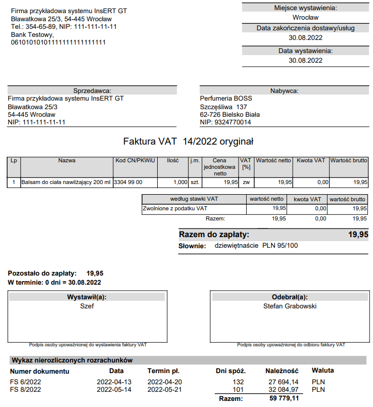Faktura sprzedaży z nierozliczonymi rozrachunkami. Nierozliczone rozrachunki (o ile istnieją) drukowane są na dole faktury w osobnej tabeli. Istnieje możliwość dowolnej modyfikacji wzorca wg wytycznych klienta – cena do ustalenia. Działa pod Subiekt GT i Navireo.