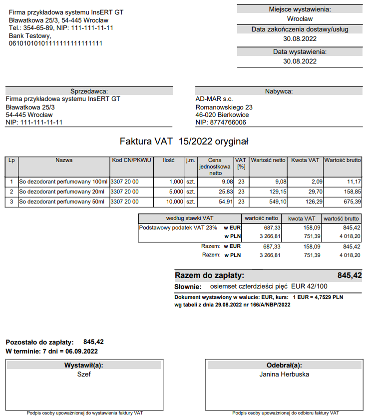 Faktura sprzedaży z walutą, kursem, numerem tabeli i datą. Numer tabeli pobierany jest ze słownika „Kursy walut”. Istnieje możliwość dowolnej modyfikacji wzorca wg wytycznych klienta – cena do ustalenia. Działa pod Subiekt GT i Navireo.